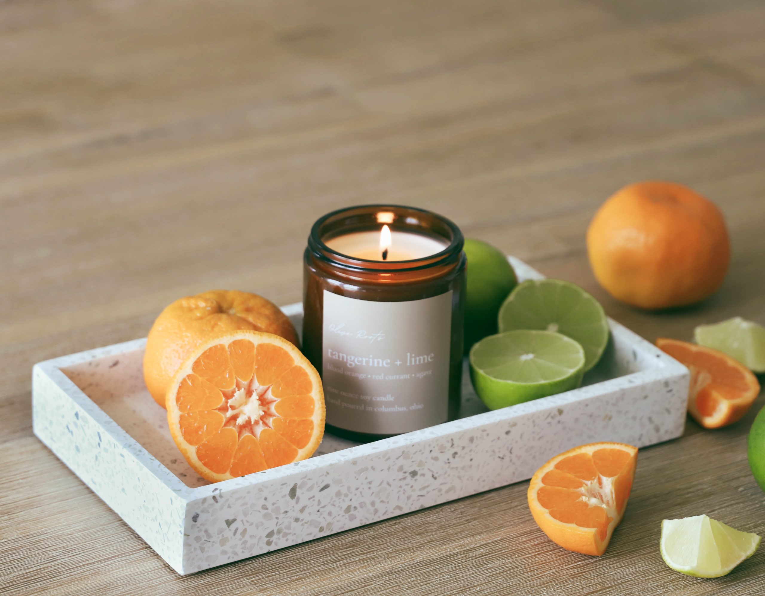 Tangerine + Lime is our take on a perfect summer day. Once you light it, everything instantly feels more fresh, warm and relaxing all at once. Notes of tropical and lively citrus like clementine, Tahiti lime, and blood orange blend with a hint of sugar to create an irresistible scent.